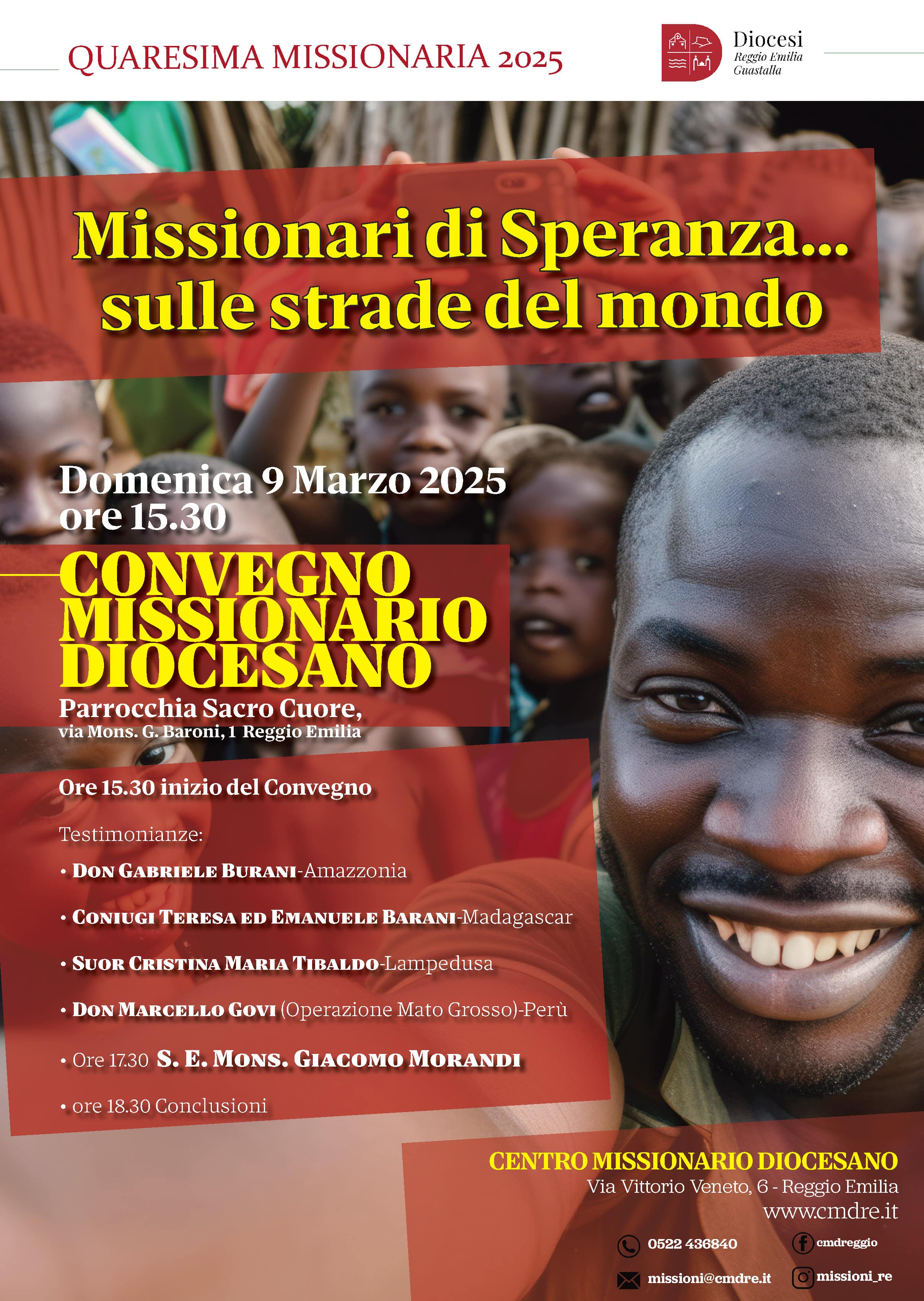 Domenica 9 marzo Convegno Missionario dalle 15.30 alle 18.30 presso la Parrocchia del Sacro Cuore a Reggio Emilia. Ascolteremo testimonianze di missionari “locali” da poco rientrati dalla missione: don Gabriele Burani (dall’Amazzonia) e Emanuele Barani e Maria Teresa Gambigliani Zoccoli (dal Madagascar). Ci sarà poi l’intervento di suor Maria Cristina Tibaldo che ha trascorso un mese a Lampedusa in un Progetto di accoglienza per migranti e di don Marcello Govi, dell’Operazione Mato Grosso (Perù).