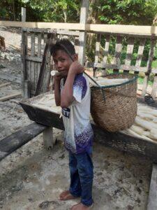 Sono le donne alla conduzione e alcuni adolescenti, giovani e ragazze, le accompagnano. Raggiunta la terra, subito c’è un gran movimento e vengono riempite grosse gerle di vimini e comincia una lunga processione di donne, ragazze, giovani e anche alcuni bambini, tutti caricando il peso appoggiandolo sulla testa con un robusto laccio di cipó ricavato da una pianta. Io non riuscirei, da solo, a sollevare una di queste gerle, ma due aiutano il portatore a caricarla sulla schiena e ad assicurare il laccio sulla testa. Così il peso è spalmato sulla colonna vertebrale e ognuno riesce a portare la grande gerla. Nel mentre vedo alcuni anziani attivare una specie di grande grattugia mossa a motore e man mano che arrivano le gerle piene, subito il prezioso contenuto viene grattugiato. Dovrà essere pressato per togliere l’acqua velenosa e cotto nei grandi forni della cucina comunitaria. All’improvviso un urlo interrompe l’armonia del lavoro comunitario. I bimbi si divertono a tuffarsi nel fiume e le mamme si sgolano avvertendoli che è pericoloso ora che l’acqua è alta, ci possono essere dei serpenti. Di fatto, dall’alto, gli uomini vedono una sucurí (serpente velenoso che può raggiungere anche i cinque metri di lunghezza) avvicinarsi. Immediatamente un giovane si tuffa e con un grosso bastone e macete riesce a uccidere il pericoloso animale, ora collocato sulla riva del fiume per ricordare il pericolo sempre presente. Vedo una mamma correre alla canoa con un remo in mano, si allontana alcuni metri fino a raggiungere un ragazzino, suo figlio, conosciuto da noi come “il pescatore”, perché sempre intento a pescare.