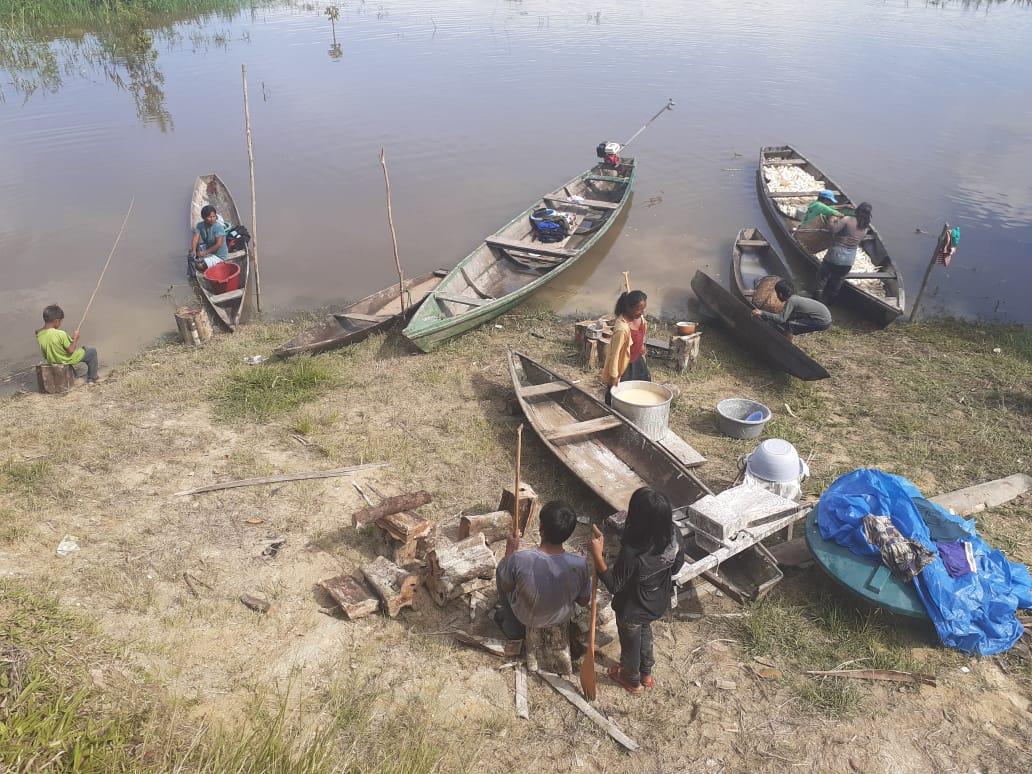 È il primo viaggio missionario del 2024, dal 10 al 23 gennaio, ogni Comunità ha il suo giorno fisso, per aiutare a ricordare il giorno della messa mensile. Qualcuno ricorda, molti no, ma noi continuiamo fedeli, secondo il proverbio: “Acqua molle in pietra dura, tanto batte che alla fine fura”. Abbiamo incontrato le tre Comunità del Solimões e siamo entrati nella foce dell’Içá. Nossa Senhora de Nazaré, São João do Japacuá, Santa Maria e, finalmente, Vista Alegre, Comunità indigena Ticuna. Sono 18 famiglie, la maggioranza molto giovani, ma non mancano i nonni, gli anziani che si riempiono gli occhi di speranza vedendo crescere i molti nipoti. Arriviamo presto, verso le tre del pomeriggio e subito siamo accolti da un picchiettare di martelli. Gli uomini stavano lavorando per rifare la copertura di una grande cucina comunitaria, dove si prepara la farina di manioca e la macaxeira, con tre grossi forni per cuocere e avere le provviste per il tempo in cui l’acqua coprirà la terra e non si potrà più piantare. I più giovani stavano sul tetto e gli anziani a terra passando il materiale per la copertura. Santiago e Moisés, cassique e pajé, dirigono i lavori perché tutto sia fatto secondo una logica comune. È bello vederli lavorare in armonia per qualcosa che non è di qualcuno in particolare, ma appartiene a tutti, è per la vita della Comunità. Sentiamo il motore di due canoe che si avvicinano, caricate fino al limite dell’acqua con manioca e macaxeira.