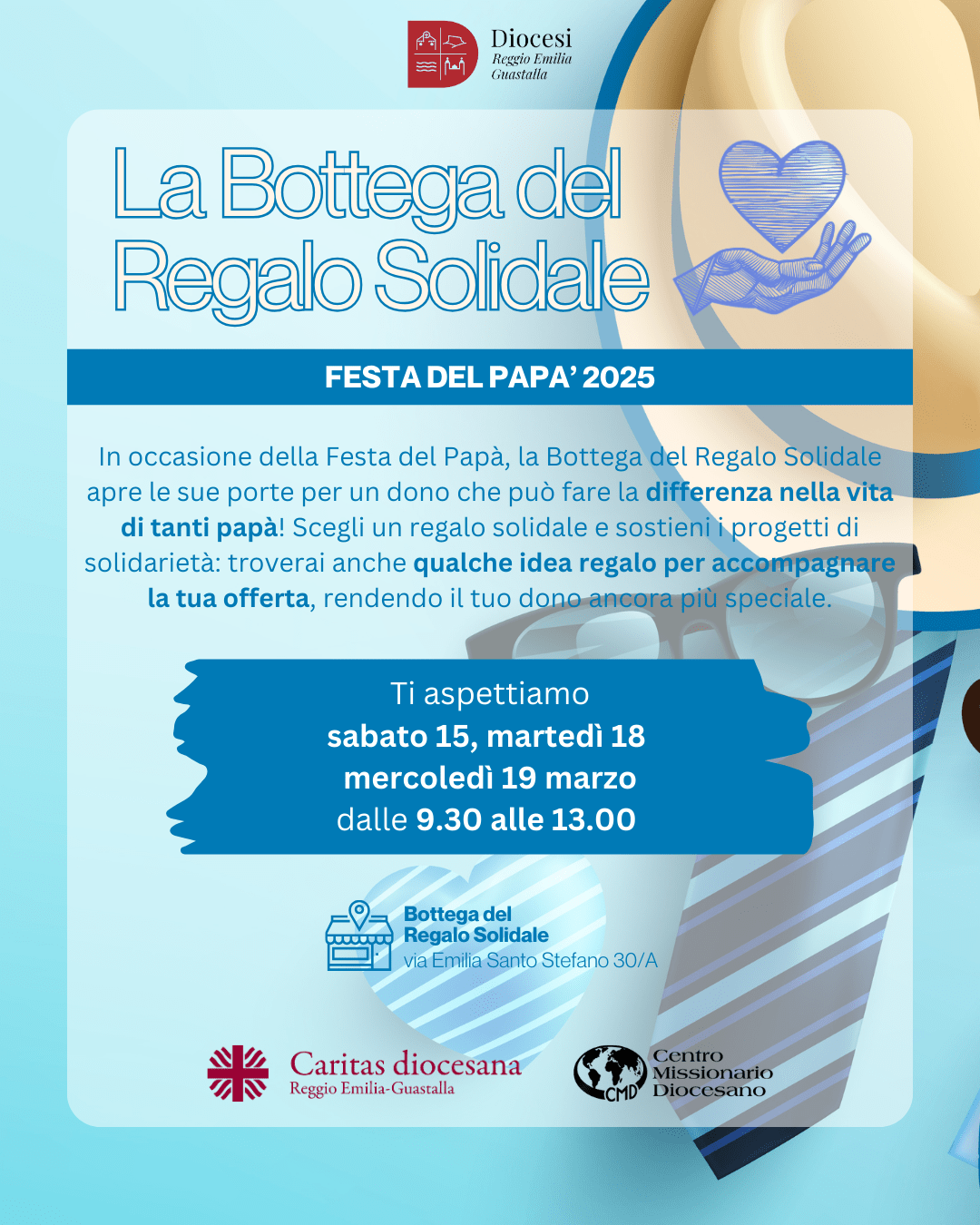 Ad accompagnare queste donazioni, la Bottega offre una selezione di piccoli oggetti o dolci regali come svuota tasche, creme spalmabili, il Bauletto della Casa del Miele, nocino e limoncino, oltre alla birra artigianale Biova, prodotta con gli scarti del pane, perfetti per rendere il gesto ancora più speciale. Oltre agli appuntamenti dedicati alla Festa del Papà, la Bottega del Regalo Solidale sarà aperta anche in altre occasioni speciali nel 2025 per Pasqua (5-6, 11-12, 17-18-19 aprile), la Festa della Mamma (9-10 maggio) e Reggio Narra (25 maggio). Un’occasione per scegliere un dono che fa la differenza e sostenere i progetti di Caritas e del Centro Missionario Diocesano.