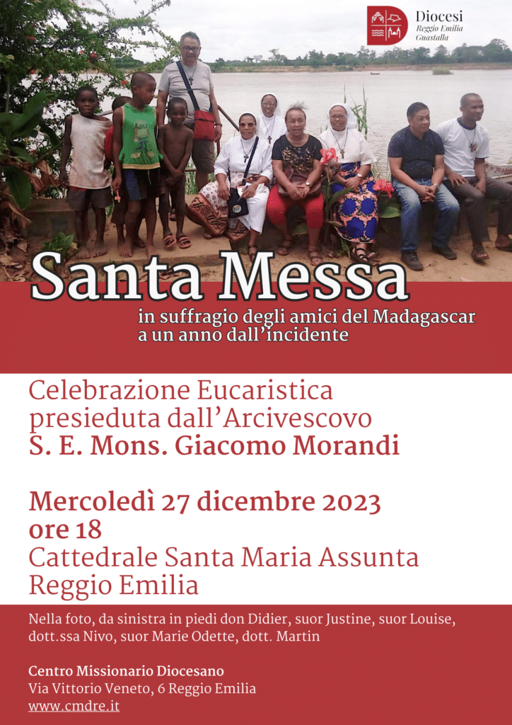 Ad un anno dall’incidente, mercoledì 27 dicembre alle ore 18 nella Cattedrale Santa Maria Assunta di Reggio Emilia, ricorderemo gli amici del Madagascar don Didier, suor Justine, suor Louise, dott.ssa Nivo, suor Marie Odette e il dott. Martin.