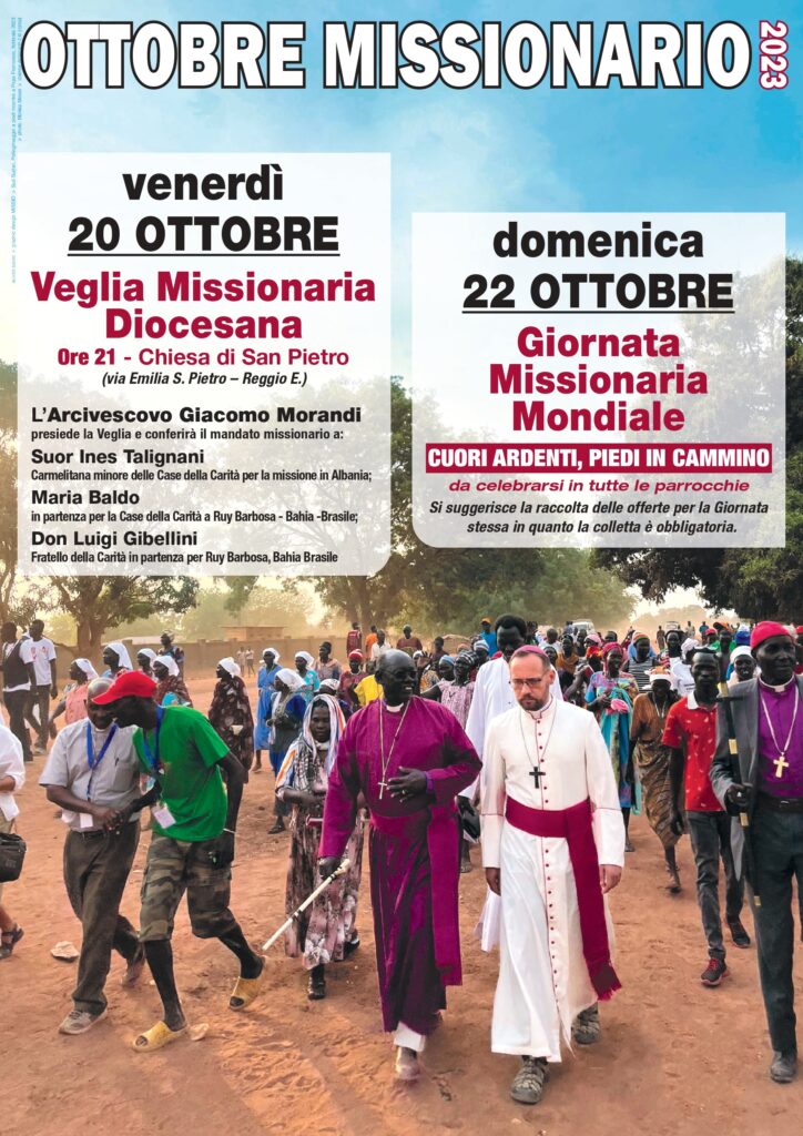 Venerdì 20 ottobre, alle ore 21.00, celebreremo la Veglia Missionaria Diocesana dal tema “Cuori ardenti, piedi in cammino” nella Chiesa Parrocchiale dei Santi Pietro e Giacomo, via Emilia San Pietro, Reggio Emilia.Presiederà la Veglia l’Arcivescovo S.E. Monsignor Giacomo Morandi che conferirà il mandato missionario a: Suor Ines Talignani, Carmelitana minore delle Case della Carità per la missione in Albania; Maria Baldo in partenza per la Case della Carità a Ruy Barbosa – Bahia, Brasile; Don Luigi Gibellini Fratello della Carità in partenza per Ruy Barbosa – Bahia, Brasile.