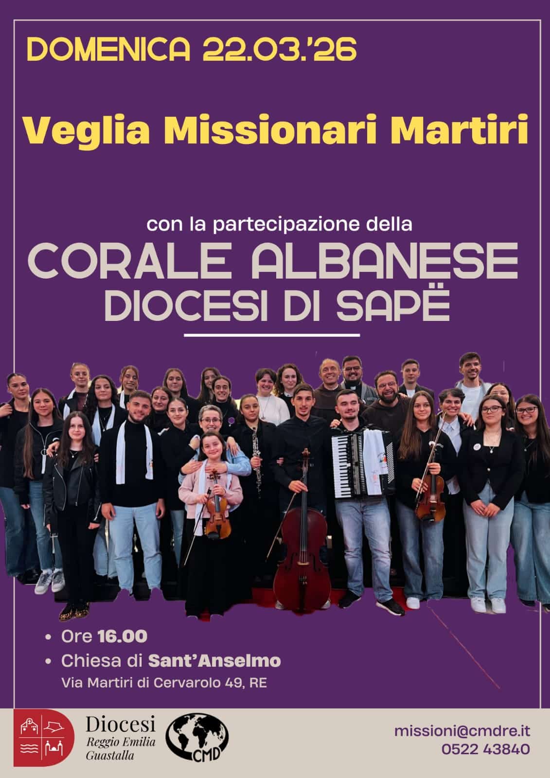 Domenica 22 marzo dalle ore 16.00 nella parrocchia di Sant’Anselmo in città a Reggio Emilia si terra la Veglia dei missionari martiri. Quest’anno la novità è che la parte liturgica della Veglia sarà curata dal Coro della Diocesi di Sapë, Chiesa gemellata con Reggio Emilia da più di 30 anni.